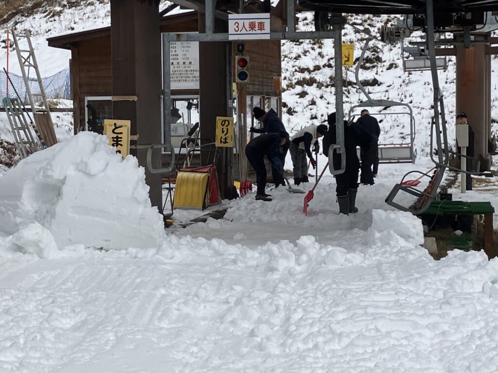 オープンまであと3日、今日は索道スタッフにより第1、第4リフトの乗り場・降り場に雪入れを行いました。圧雪車で各リフトへ押した雪を人力で敷いていきます。