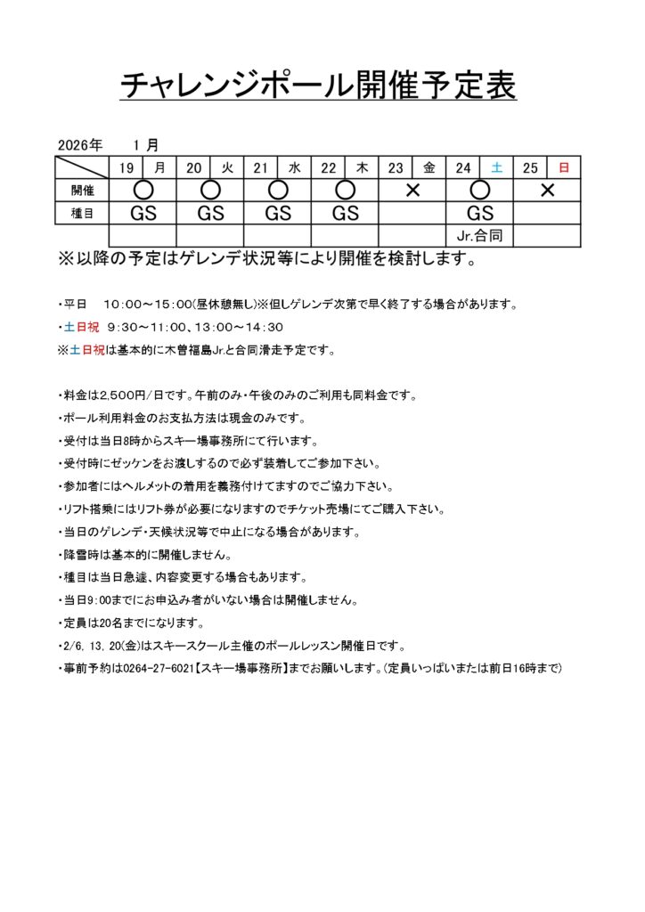 有料ポール滑走「チャレンジポール」の開催情報をこちらに記します。