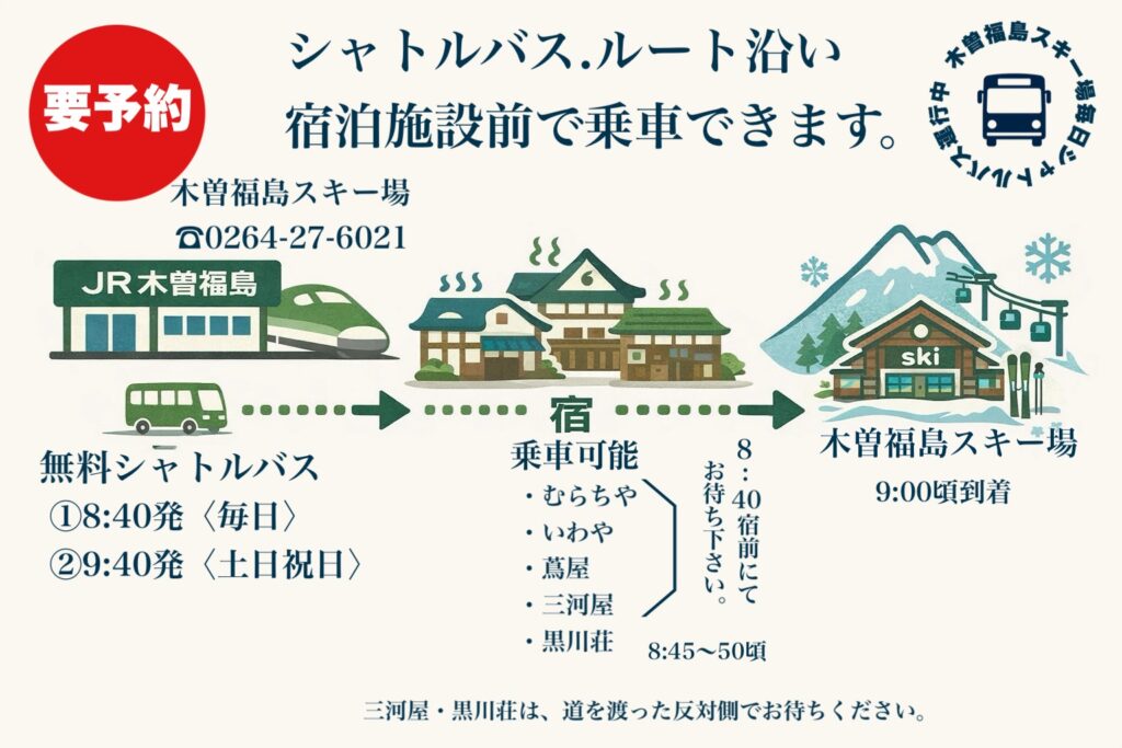木曽福島駅から毎日無料シャトルバスが運行中です。かれこれ無料シャトルバスの運行をはじめて20年近くなりますが、年々乗車する方が増えています。最初は8時40分のバスに誰も乗らないなんてことは多々ありましたが、昨シーズンは0人乗車は0日、今シーズンも同じく0日と必ずご乗車いただいています。今シーズンからルートを確立して町内の旅館経由での運行となったので、旅館前にて乗車される方も増えています。これから2月いっぱいは平日でも10人以上は乗られると思うので必ずご予約をお願いします。ご予約の人数によっては2台運行となります。