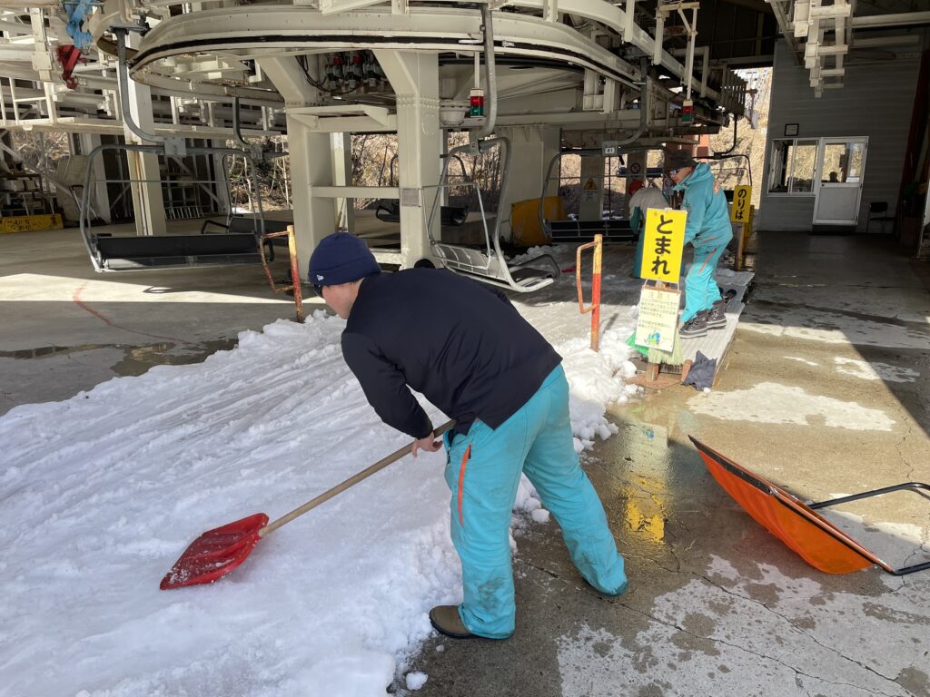 索道係も朝の雪入れから始まり、日中も乗り場降り場に雪入れをしながら各乗り場、運転係をこなします。ハイシーズンであれば雪入れ作業も軽い雪なので楽ですが、この時期は重い雪になるので重労働です。