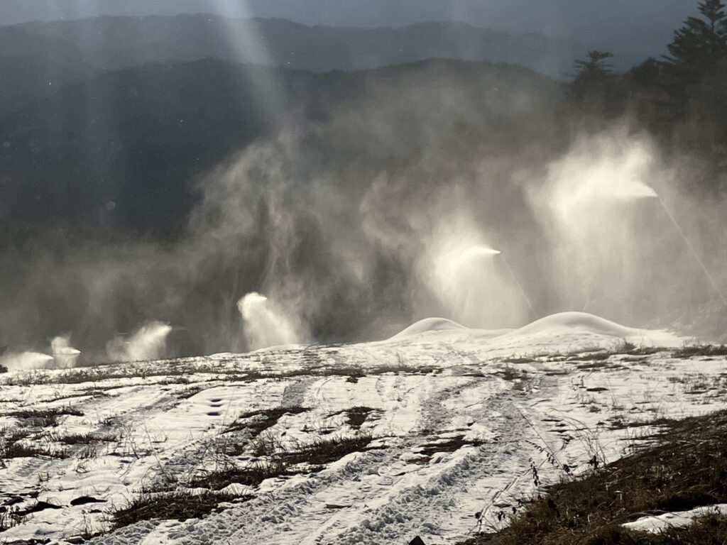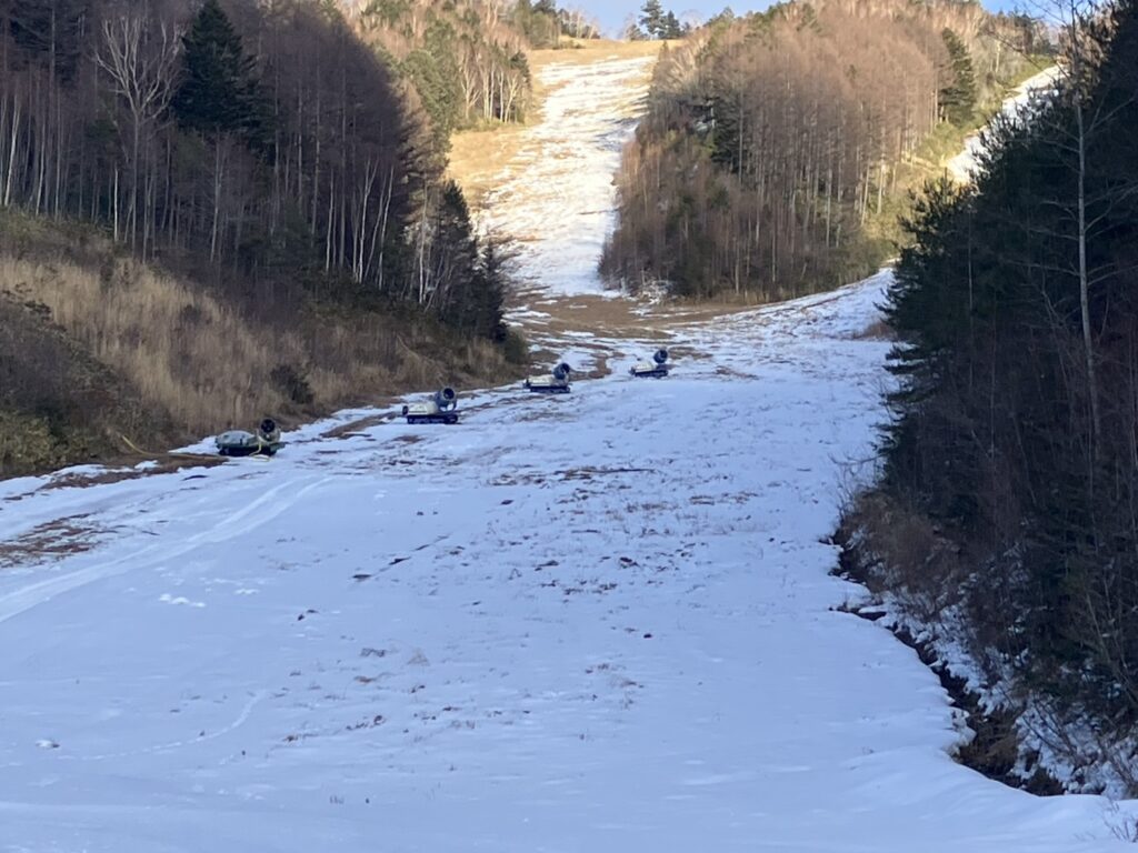 低気圧が過ぎ少し寒気が下りてきたのでシークレットコースで降雪作業が再開しました。暖気が居座る時間が長く今朝も中々気温が下がらずファンタイプは断念しシークレットA中間のルビーが終日頑張ってくれました。ファミリーコースが冷えないときにシークレットコースでルビーが稼働していたのである程度雪山になっています。