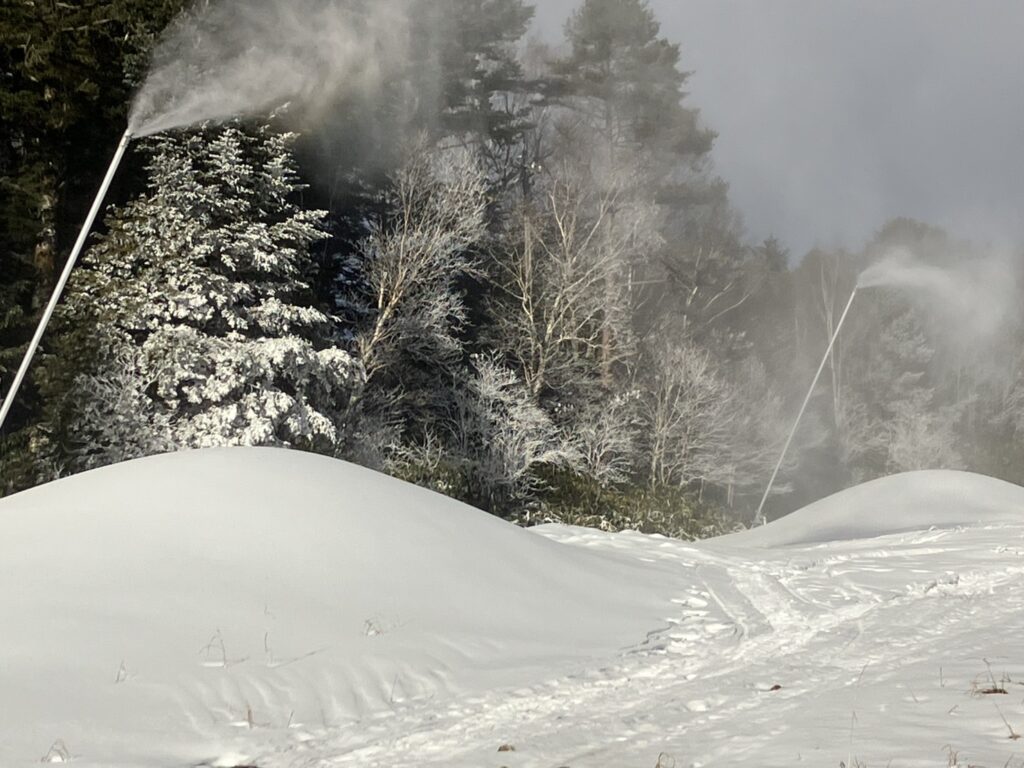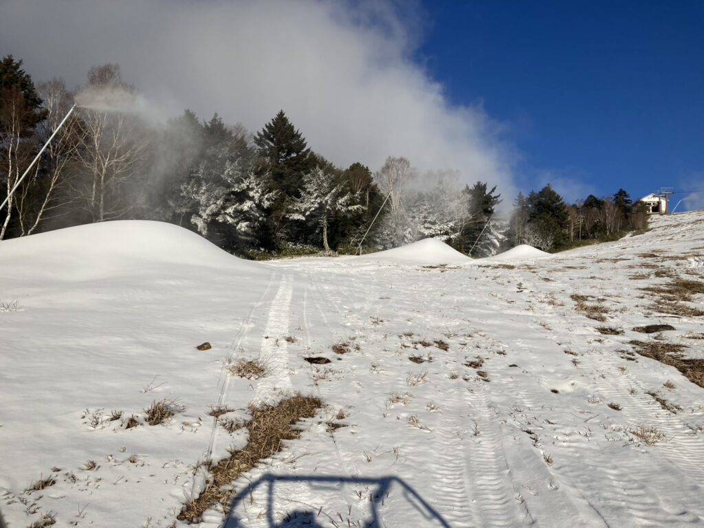 昨晩は気温が少し高めでしたが湿度が低かったので思ったより降雪できました。今日の日中作業はスネークからスネーク落としまでの降雪作業で作った雪山を圧雪車で押して滑走できる状態に作業しています。クワッド乗り場からスネーク落とし下までは繋がりました。あとはファミリーBになりますが、午後から全移動しファミリーBを集中降雪予定です。